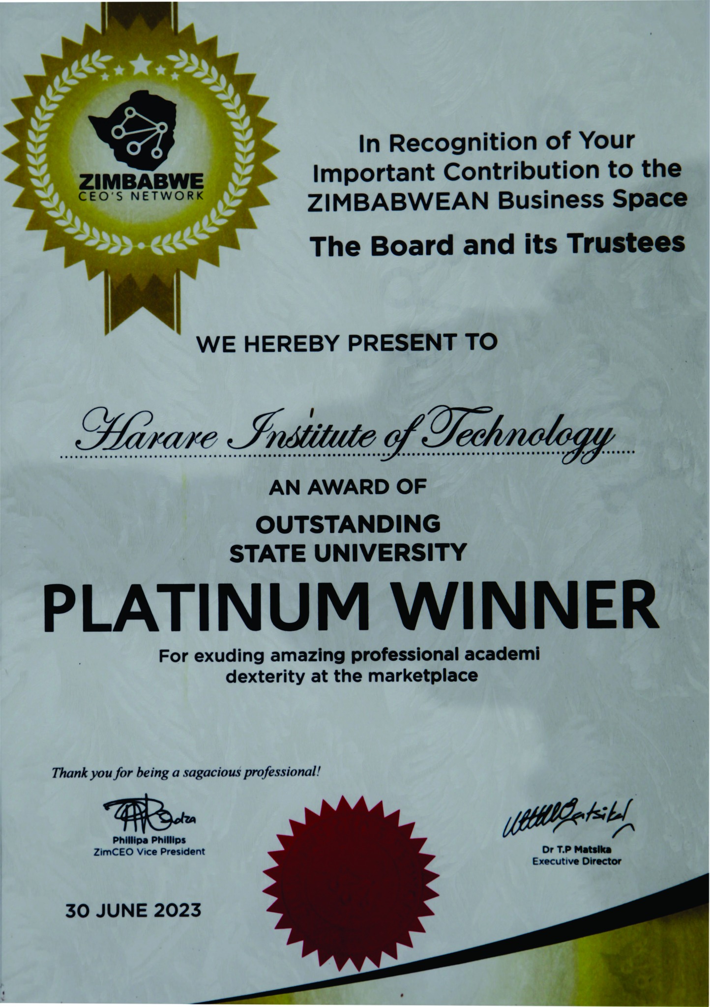 The Harare Institute of Technology (HIT) received two Platinum and a Gold award at the Zim CEO Leadership Awards held on the 30th of June 2023 in Harare.
